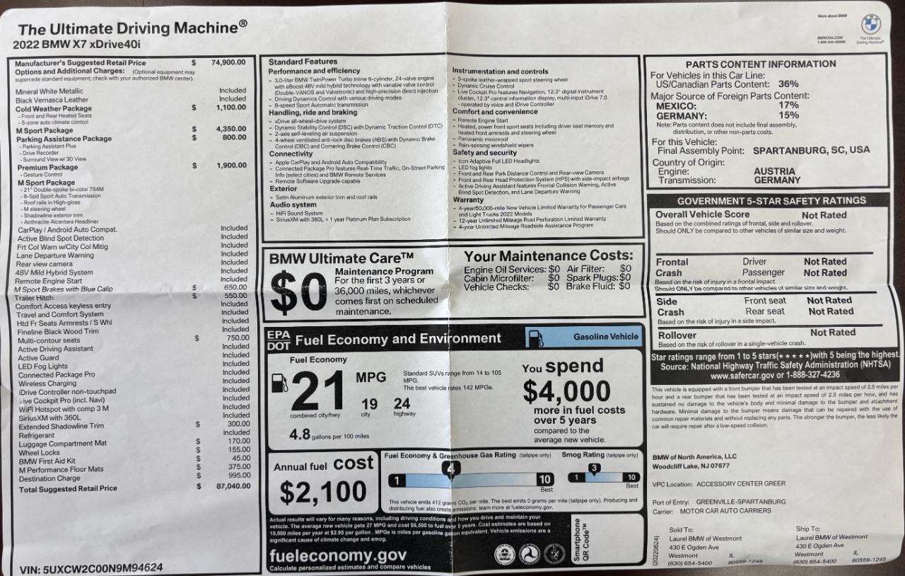 Arriving in 45 days, this stunning 2022 BMW X7 xDrive40i will soon be available at Oswego Motors. This luxury 3-row SUV had an original MSRP of $87,040 and comes with premium features such as:
